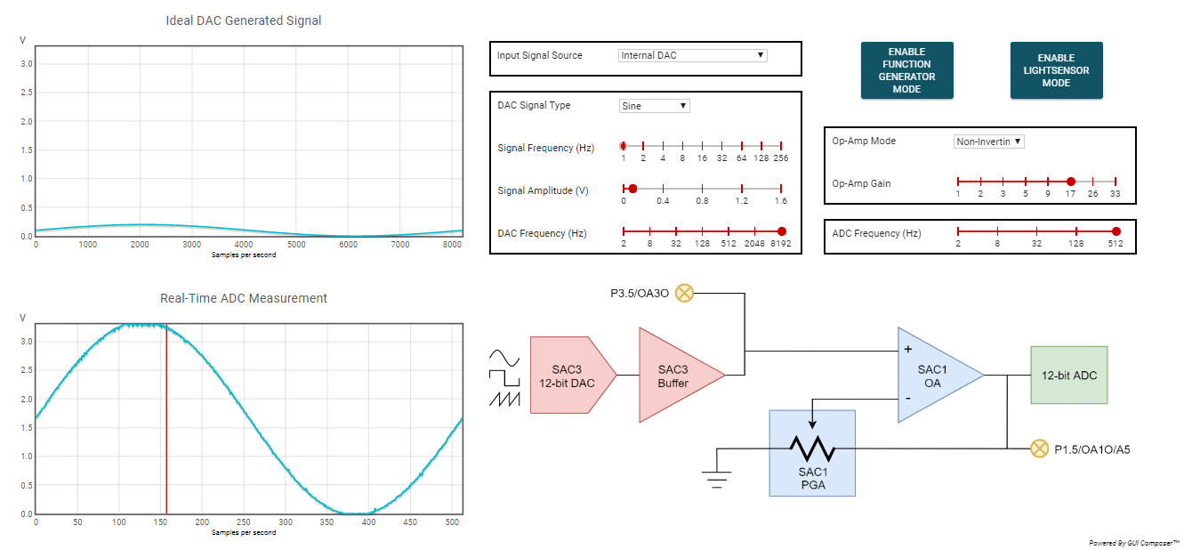 Nos dois primeiros demos o sinal é gerado pelo DAC e o usuário tem um feedback da ação do PGA (AmpOp) através do ADC, detalhe que o roteamento disso é interno, o que facilitar mais ainda.