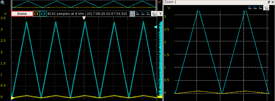 O demo ainda permite selecionar uma das entradas do PGA conectadas externamente, permitindo que utilizemos o OpAmp com um sinal externo. Apliquei um sinal triangular com 50 mVp e 50 mV de offset e configurei o PGA como amplificador não inversor com ganho 33x. Na interface é possível ver o resultado através do próprio ADC de 12 bits do uC funcionando como um osciloscópio.