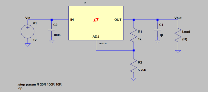 Usaremos esse diagrama para entender o funcionamento nesse circuito e também confirmar que a fórmula da figura 1, obviamente faz sentido. Montei o seguinte circuito no LTspice para nos suportar nessa análise. O tipo de análise que utilizei foi ponto de operação DC (DC op pnt). Também apliquei a diretiva spice (.step param R 20R 100R 10R), para simular variações da resistência de carga, sendo assim, acompanharemos a regulagem de tensão do circuito.