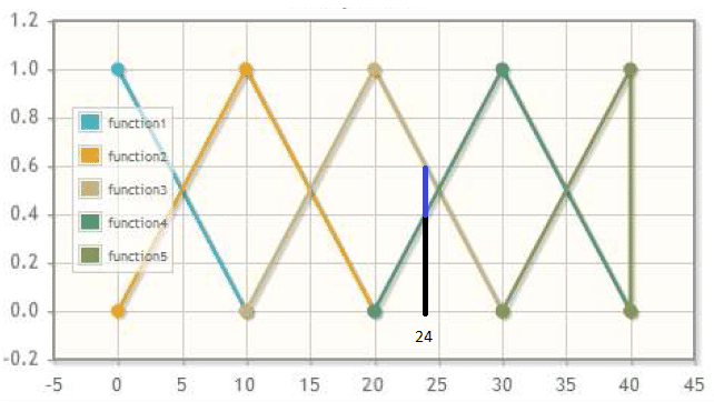 O grau de pertinência é calculado dentro da função ‘Fuzzyphy’ utilizando a teoria de semelhança de triângulos. No exemplo abaixo podemos observar que para um valor analógico igual a 24, aplicado à entrada A, é possível encontrar o valor de grau de pertinência 0.4 no subconjunto ‘function4’ rotulado como ‘SubAlto’ na aplicação, e o valor de grau de pertinência 0.6 para o subconjunto ‘function3’ rotulado como ‘SubNeutro’ na aplicação, conforme a Figura 2.