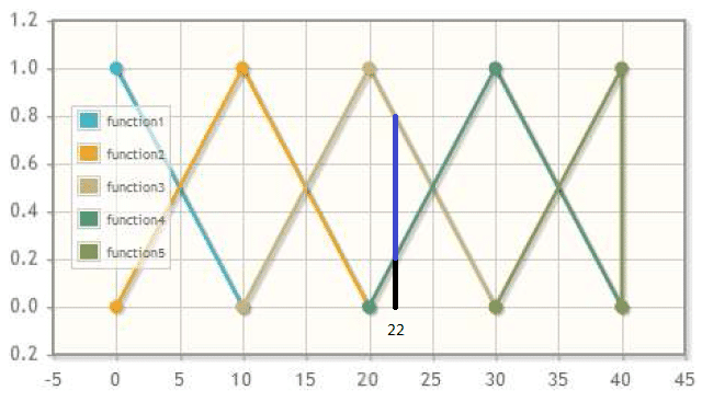 Neste caso os graus de pertinência calculados para essa entrada são de 0.2 para o subconjunto ‘function4’ e de 0.8 para o subconjunto ‘function3’. Assim, supondo que exista a seguinte regra, (Para A=function3 & B=function3 ENTÃO C=function3), então o valor mínimo escolhido para o grau de pertinência, resultante desta regra, será de 0.6, que representa o valor mínimo obtido através da função ‘Fuzzyphy’ para os subconjuntos ‘function3’ quando o valor analógico da entrada A for igual a 24 e da entrada B igual a 22. Supondo outra regra, (Para A=function3 & B=function4 ENTÃO C=function3), o valor mínimo será de 0.2 que é o valor do grau de pertinência encontrado para o subconjunto ‘function4’ da entrada B quando esta receber valor analógico igual a 22.
