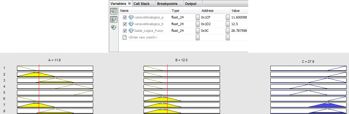 Utilizando a IDE MPLABX em modo de simulação e o software Matlab, foi realizada a comparação entre os dois sistemas, com regras e subconjuntos idênticos, obtendo os seguintes resultados.