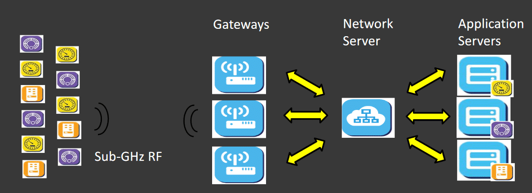 De maneira simplificada, o sistema Lora vai funcionar com um módulo sub-GHz no end-device e um gateway que enviará os dados para servidores locais e/ou remotos.