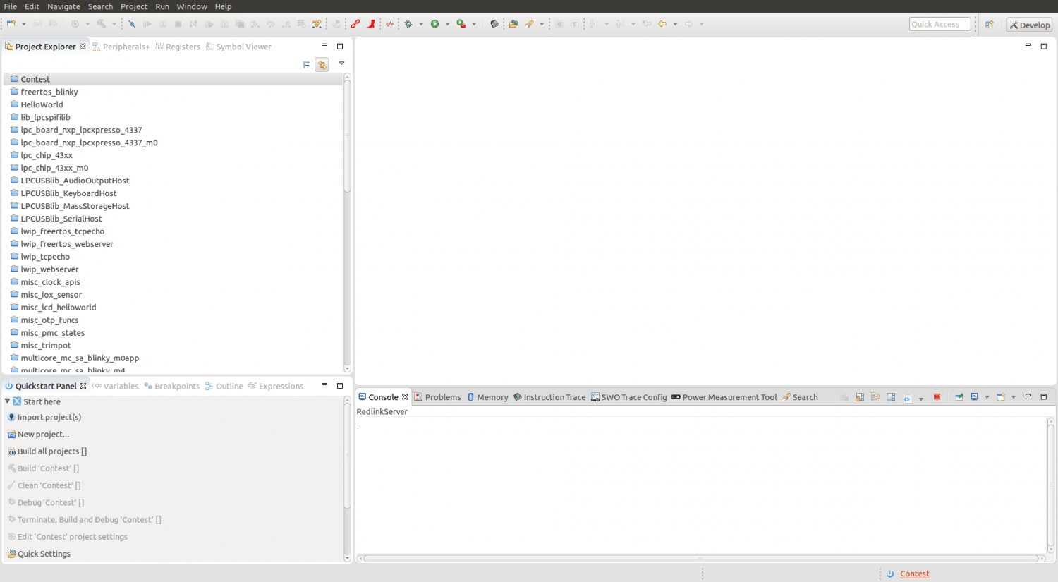 Uma vez que a IDE LPCxpresso esteja aberta com os projetos do LPCOpen disponíveis no Project Explorer, feche todos os projetos abertos (CTRL + A -> clicar com o botão direito do mouse em algum projeto selecionado -> comando Close Project no menu de contexto). O ambiente deve ficar da seguinte forma: