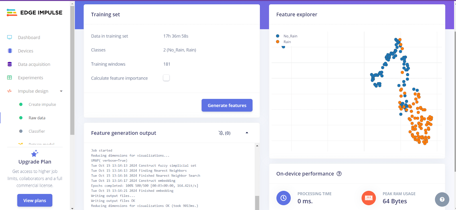 - Clique em “Raw data” e gere as features.