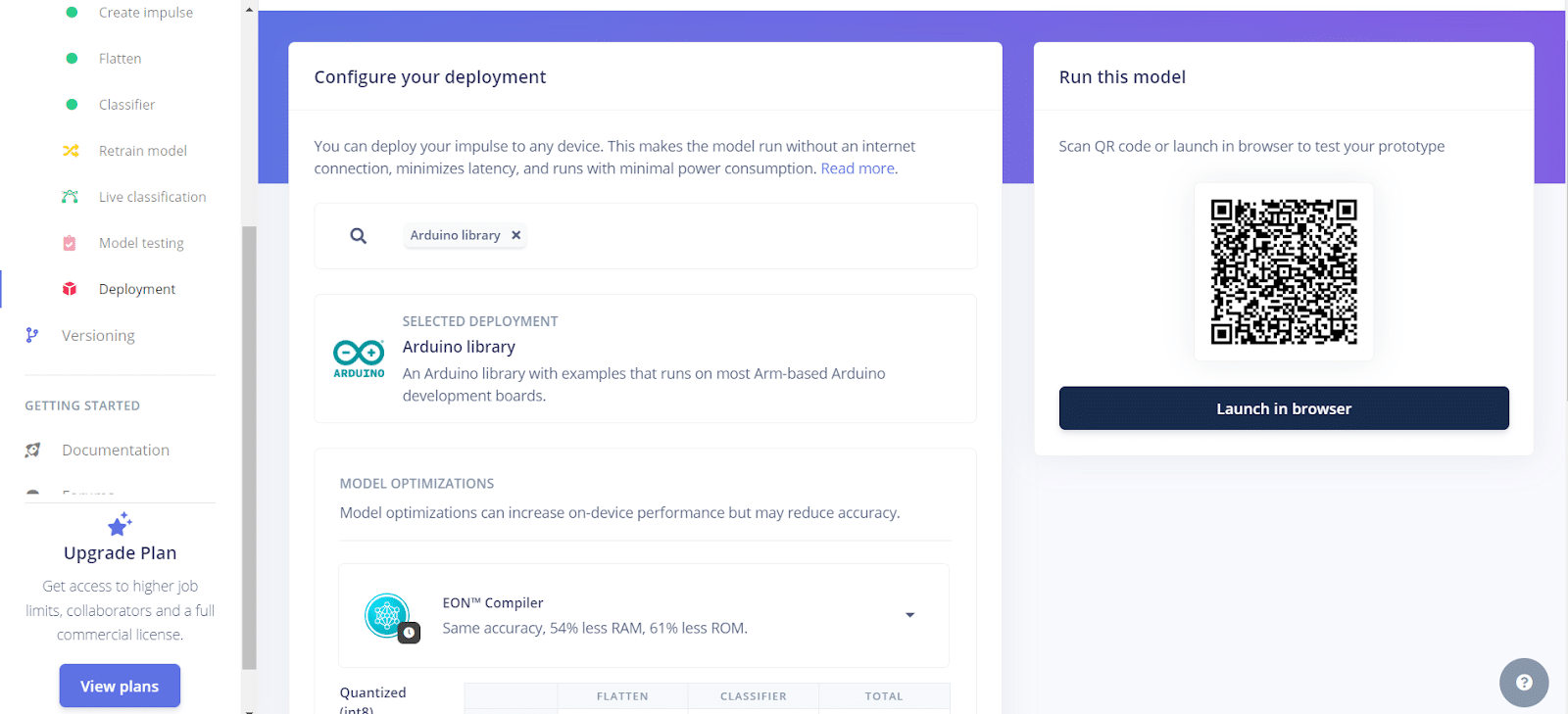 - Por fim, vamos salvar o modelo para utilizá-lo posteriormente na Franzininho WiFi. Clique em Deployment, selecione Arduino Library e execute o deploy, que gerará um arquivo zip contendo o modelo.