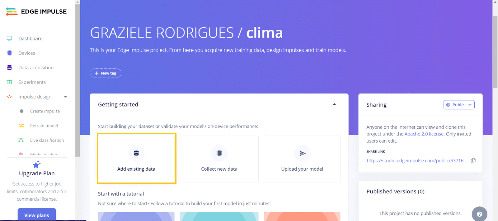- Crie um novo projeto e depois clique em “add existing data”. Você será encaminhado para a página de upload.