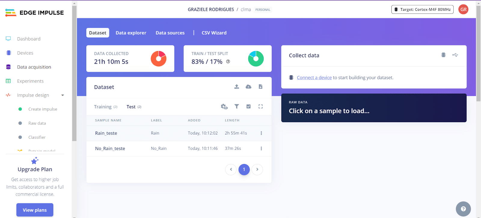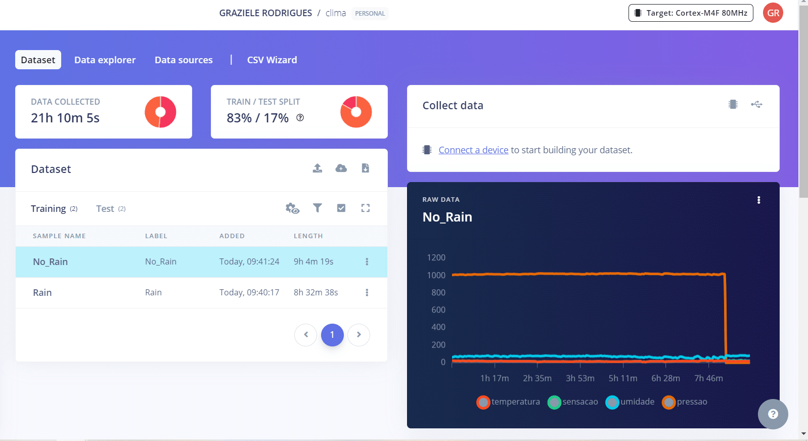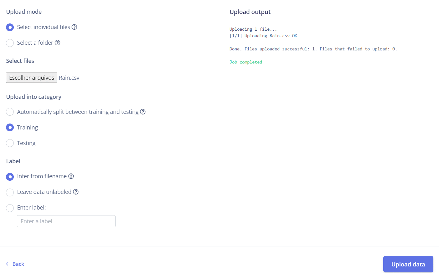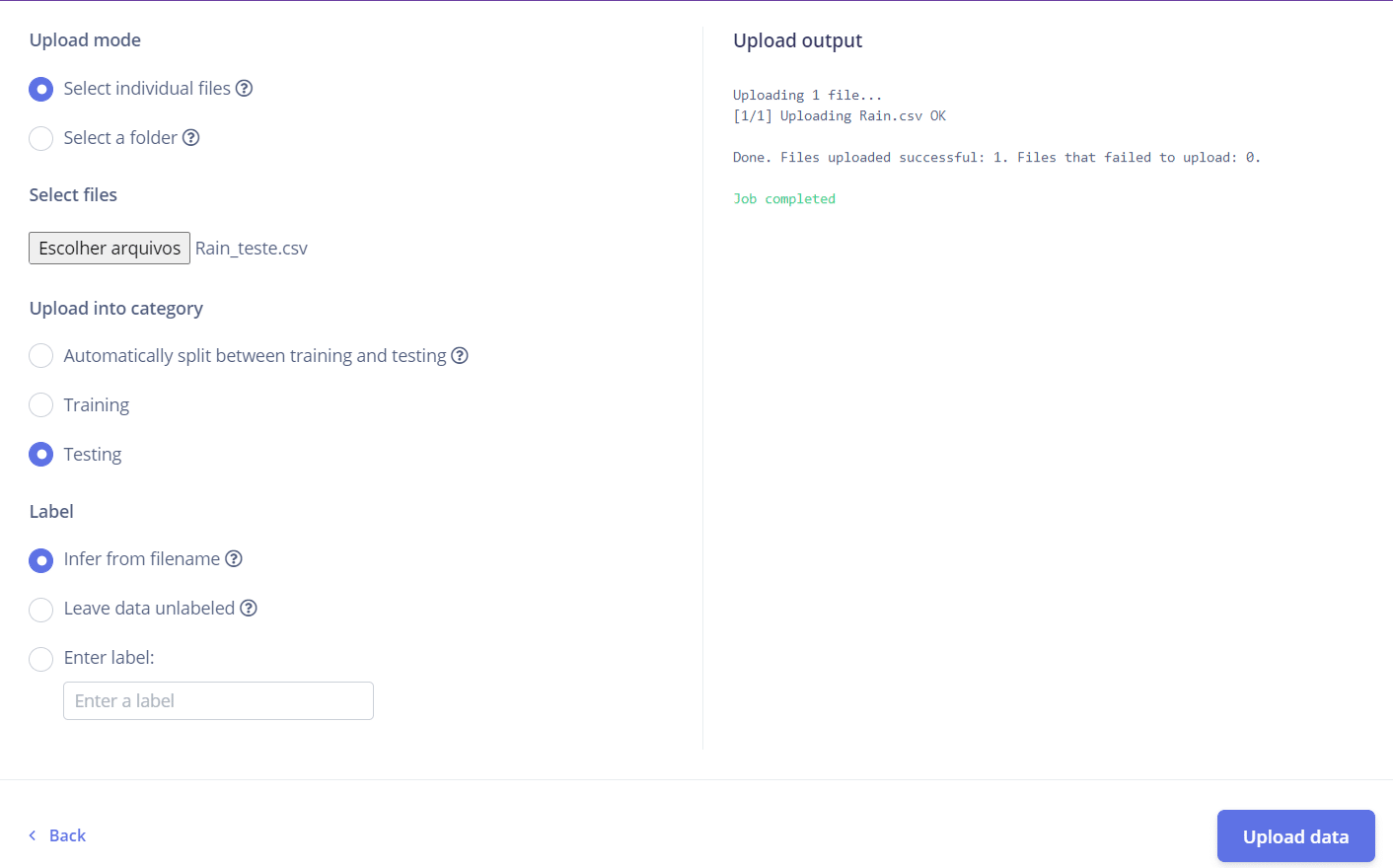 - Faça o upload dos arquivos “Rain.csv” e “No_Rain.csv” para o conjunto de treino, e os arquivos “Rain_teste.csv” e “No_Rain_teste.csv” para o conjunto de teste.