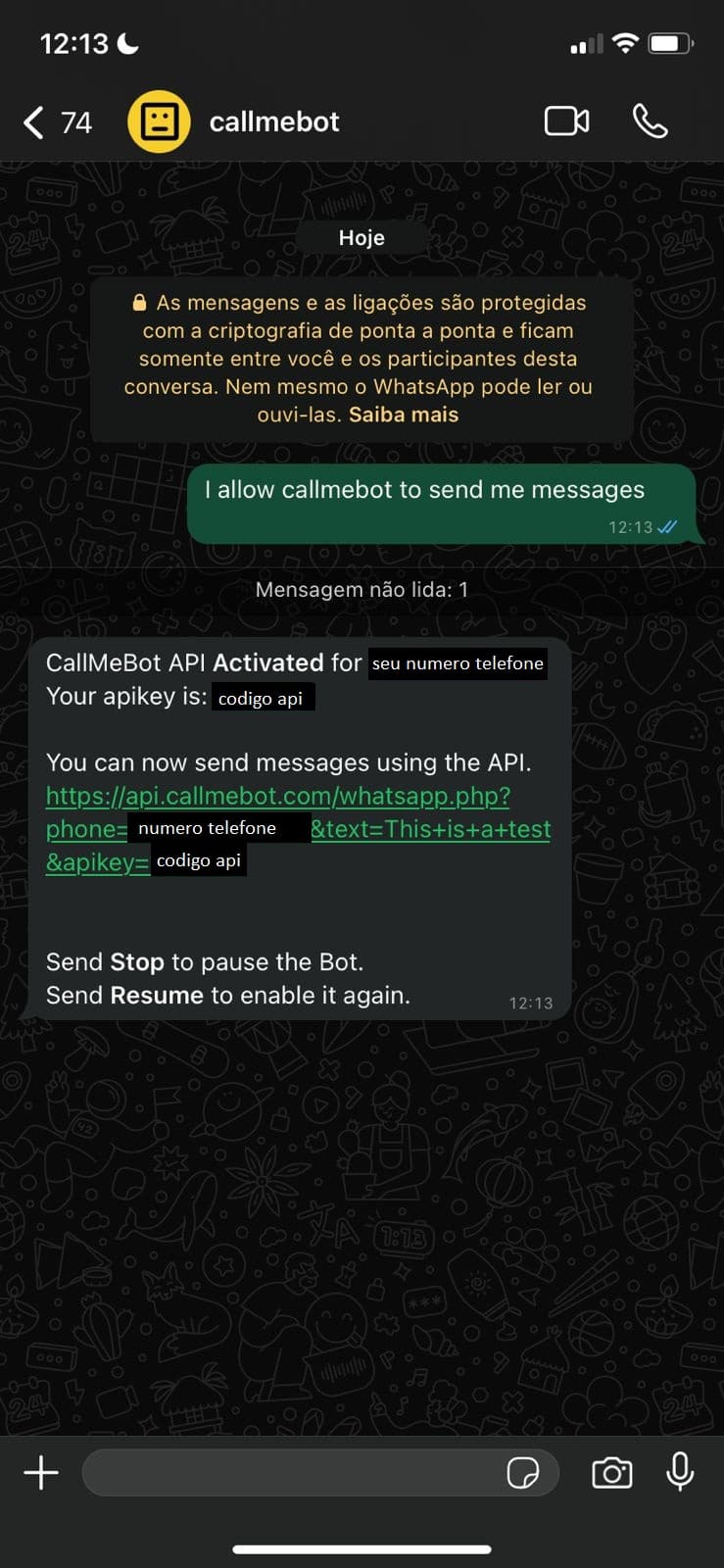 - Envie a seguinte mensagem pelo whatsapp para o número da callmebot: I allow callmebot to send me messages