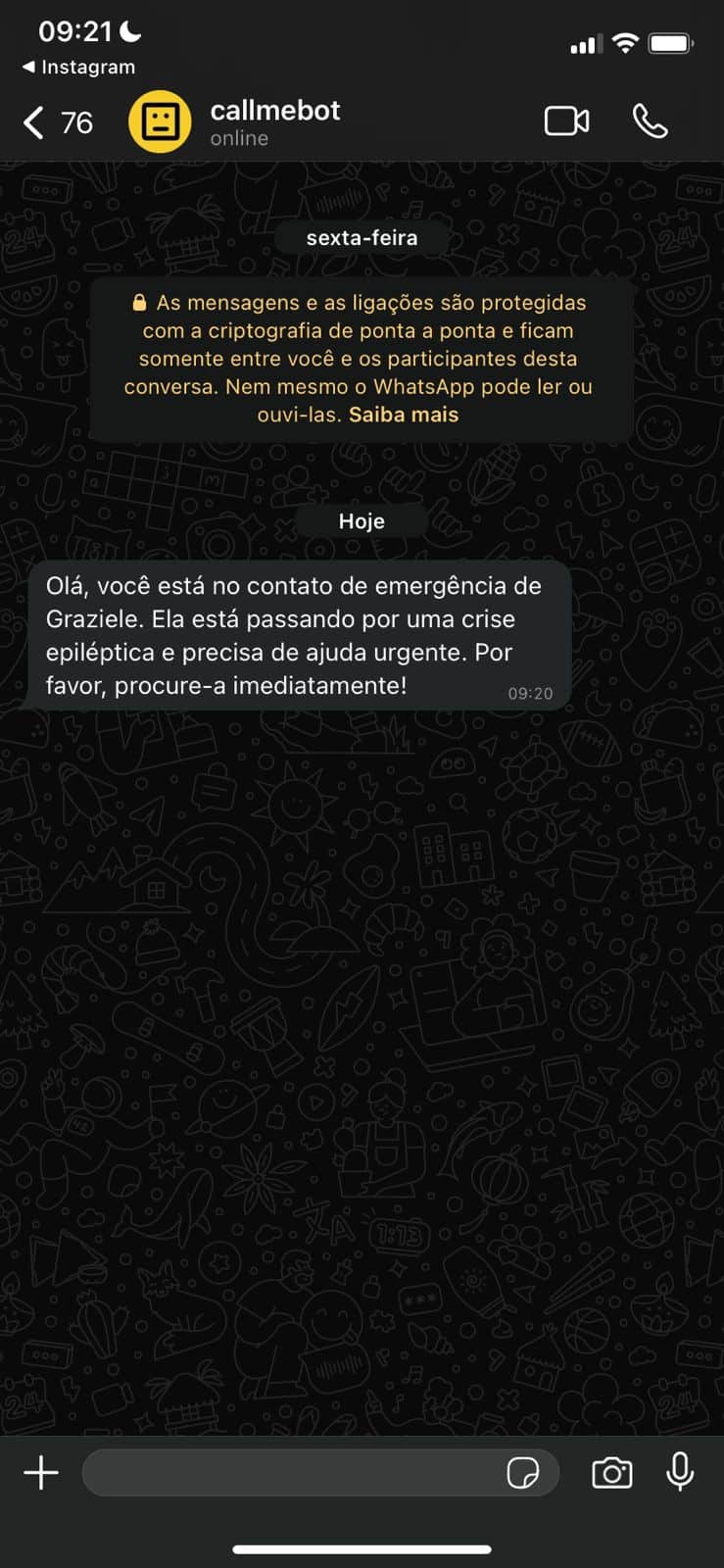 sendMessage("Olá, você está no contato de emergência de Graziele.Ela está passando por uma crise epiléptica e precisa de ajuda urgente. Por favor, procure-a imediatamente!");