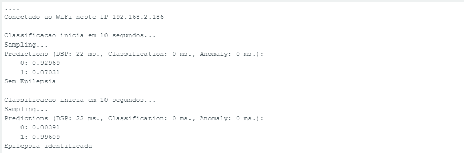 - No bloco void loop(), implemente a coleta das leituras do acelerômetro, armazenando os valores em um buffer. Para cada amostra, capture as acelerações nos eixos X, Y e Z, e calcule os ângulos de rotação (roll, pitch e yaw). As leituras, juntamente com os ângulos calculados, devem ser armazenadas no buffer para posterior análise. Em seguida, converta o buffer em um sinal que será utilizado pelo classificador. Se a conversão for bem-sucedida, execute o classificador e aguarde os resultados. Imprima no console os resultados da classificação e baseando-se nas previsões do classificador, verifique se a probabilidade de não haver epilepsia é superior a 0,8. Se essa condição for satisfeita, exiba “Sem Epilepsia” no console. Caso contrário, se a probabilidade de epilepsia for superior a 0,8, exiba “Epilepsia identificada”. Se nenhuma condição for satisfeita exiba “Nao eh possivel determinar”.