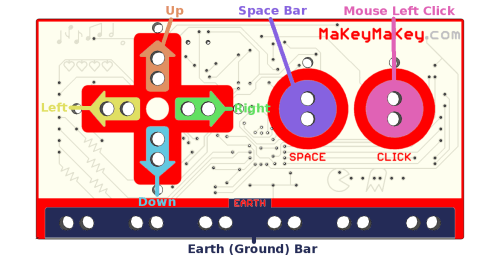 Temos as teclas “Esquerda”, “direita”, “alto”, “baixo”, “espaço” e “clique”. Colocando as garrinhas jacaré nestes espaços, ele irá interagir com seus jogos no computador, inclusive até aplicativos de texto, como Bloco de notas, gerando espaços ao pressionar uma banana!