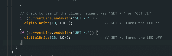 c) Ao executar esse código no Monitor Serial, ele mostrará um IP. Você poderá abri-lo em seu navegador e testar o LED, ligando e desligando. Perceba que, quando ele ligar e desligar, o endereço de IP na barra irá mudar. Iremos usar esses 2 endereços na segunda parte, no código de detecção.