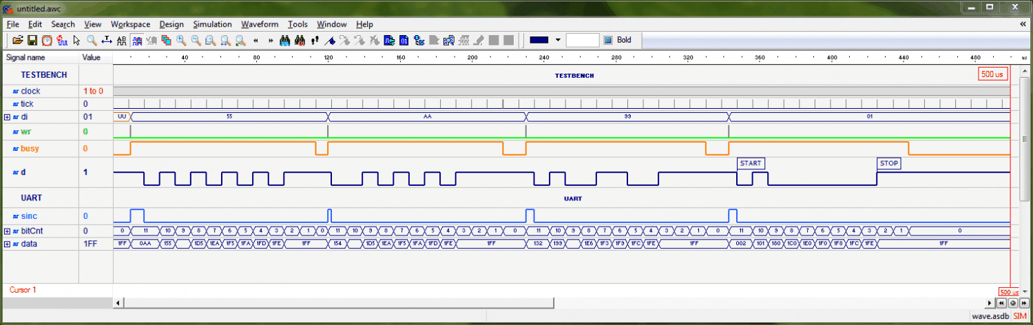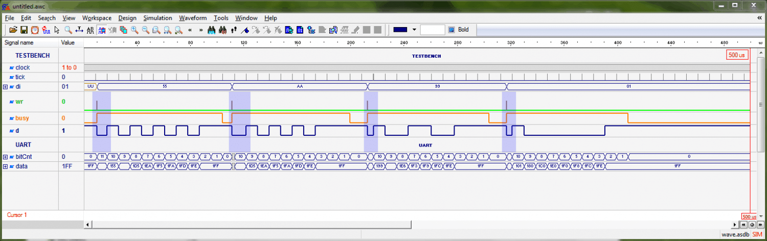 Feita a interconexão, vamos transladar a funcionalidade do bloco. Lembrando, a cada ordem de escrita por o WR os dados colocados no DI são encaminhados para a porta serial na taxa de bits marcada por TICK. Enquanto o Tx está encaminhando dados, o BUSY ficará válido, com o valor lógico 1.