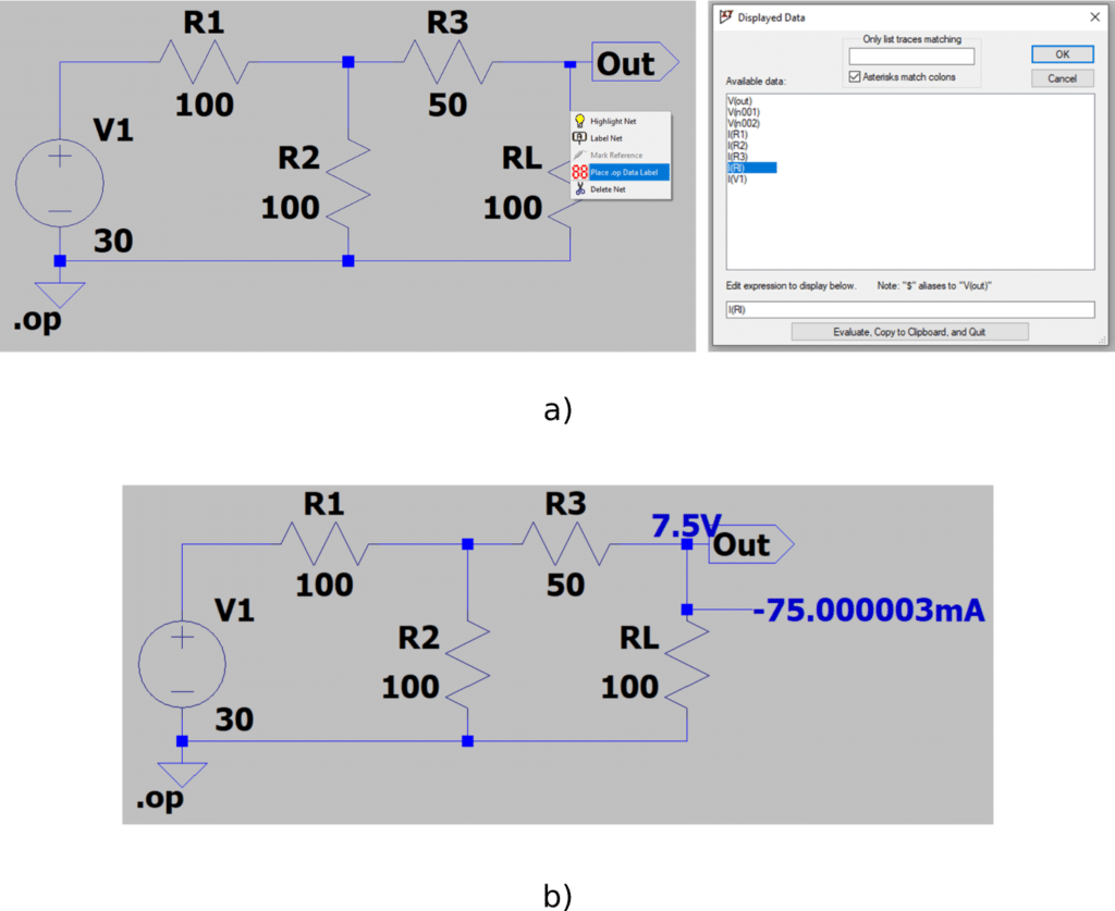 Após criar o seu circuito no LTSpice, clique no ícone “run” e escolha a simulação “DP Op pnt” (Figura 4a) para indicar para o simulador que faremos operação em regime permanente CC. Ao clicar em “ok”, abrirá uma janela com as tensões e correntes deste circuito. Além disso, para facilitar a leitura dos resultados, é interessante criar um rótulo (label) para a resistência de carga, conforme Figura 4b.