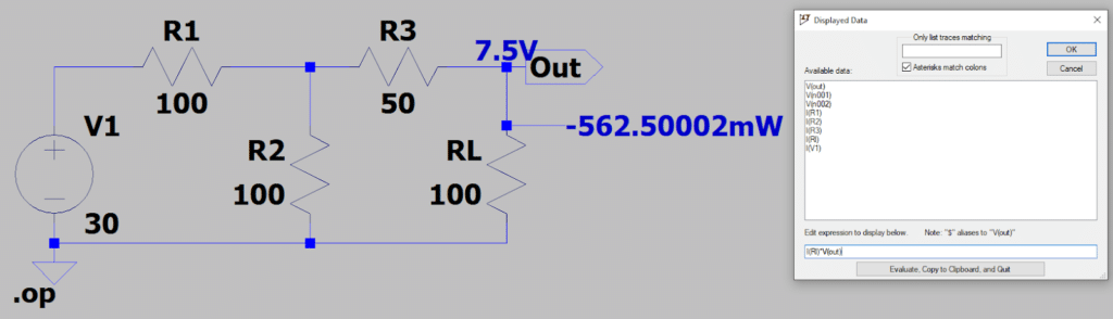 Após fechar a janela com resultados, clique com o botão esquerdo do mouse no terminal de saída para que seja apresentada a tensão em RL (9V neste caso). Você pode fazer isso também clicando com o botão direito na linha entre a label “Out” e o resistor RL e escolher a opção “place .op Data label” (Figura 5a). Para apresentar a corrente em determinado elemento, devemos clicar na tensão apresentada com o botão direito do mouse e selecionar a variável que nos interessa. Neste caso, devemos selecionar “I(Rl)” para vermos a corrente em RL (Figura 5b), que vale aproximadamente 60 mA. Uma vez que conhecemos a tensão e a corrente em RL, calculamos a potência como:
