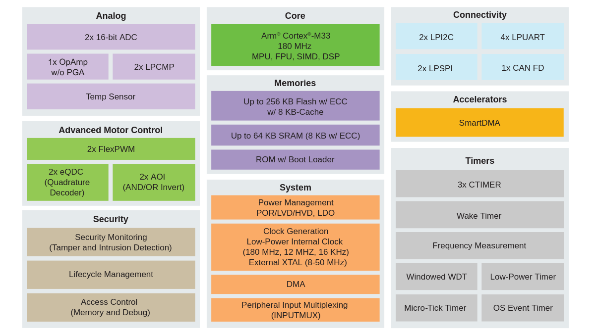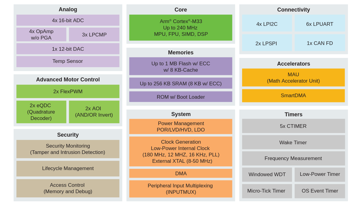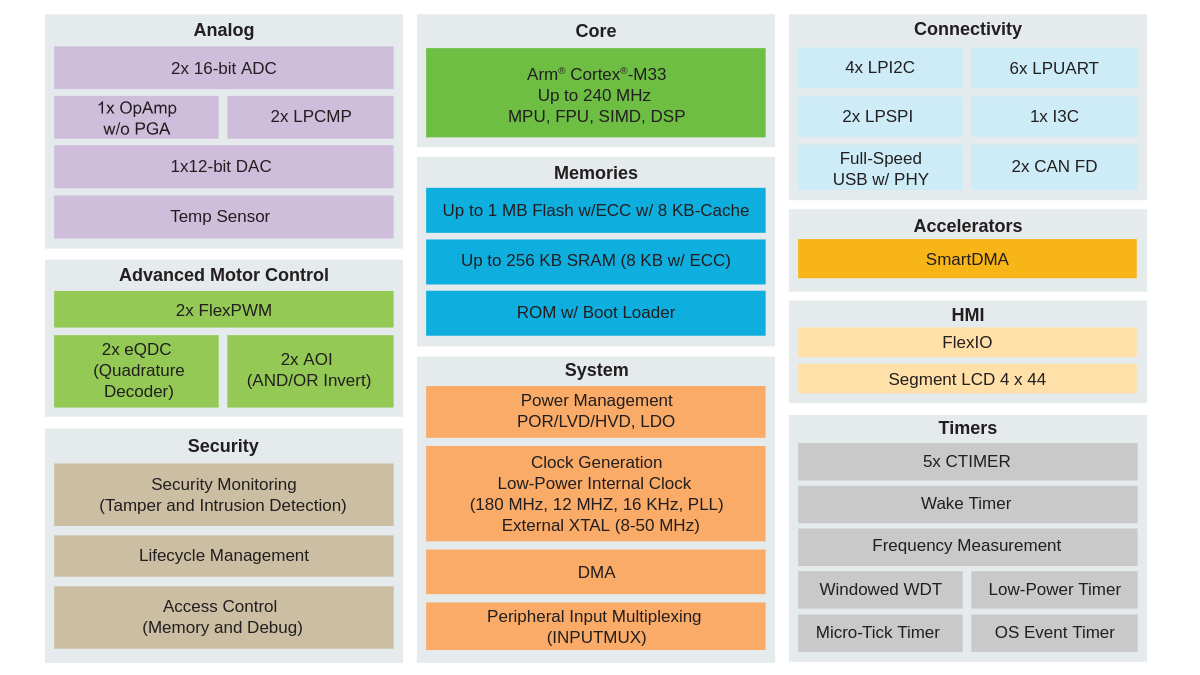 A família MCX A26 combina desempenho elevado e foco em segurança para aplicações críticas. Baseada em um núcleo Cortex-M33 operando a até 240 MHz, incorpora recursos de segurança EdgeLock, além de periféricos analógicos e funcionalidades voltadas ao controle de motores.