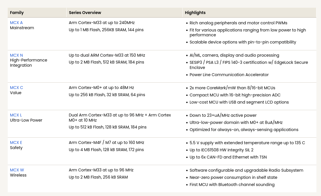 A série MCX A é apresentada como a base do portfólio MCX, reunindo microcontroladores que equilibram consumo de energia, desempenho e periféricos inteligentes. Com a chegada das novas famílias, a série passa a cobrir um espectro mais amplo de aplicações, oferecendo maior escalabilidade tanto em desempenho quanto em integração funcional.