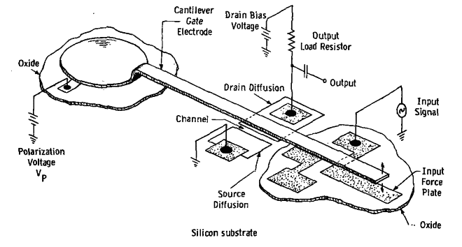 Criado utilizando técnicas que se tornaram a base para a difusão desta tecnologia nos dias atuais, o primeiro dispositivo MEMS foi desenvolvido em 1967 pelo engenheiro americano Harvey C. Nathanson. Esse dispositivo, conhecido como Transistor de Porta Ressonante [1], tratava-se, resumidamente, de um sintonizador e seletor de frequências ativado eletrostaticamente, utilizado em circuitos de sintonia RF. Esta invenção o concedeu uma patente, dentre as mais de 50 existentes em seu nome, no ramo da eletrônica de estado sólido.
