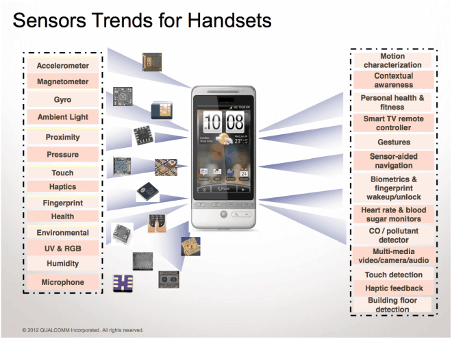 Ainda não convencido de quão próximo você pode estar da tecnologia MEMS? Veja na imagem a seguir quantos sensores podem ser embarcados em um único smartphone e as funcionalidades que eles agregam a esse produto, antes conhecido simplesmente como telefone celular: