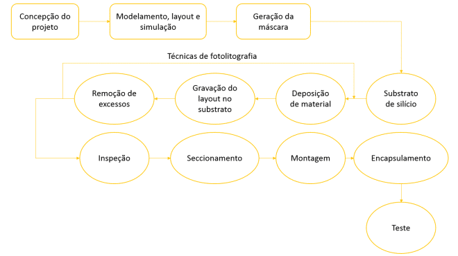 O processo de fabricação de MEMS é bem semelhante ao processo já utilizado pela indústria microeletrônica para a fabricação de circuitos integrados, como apresentado no fluxograma abaixo:
