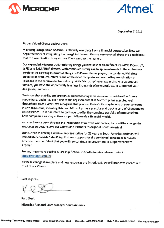 A aquisição da Atmel pela Microchip foi consolidada em 2016, e atualmente, todos os funcionários Atmel se tornaram Microchip e trabalham juntos como um time global e com uma estratégia unificada para a indústria de semicondutores.