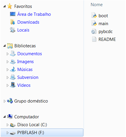 2) Conectada a placa, esta será reconhecida como unidade “PYFLASH (X:)”, caso contrário, o driver será automaticamente instalado;