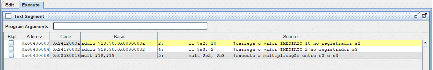 .text li $s2, 10 #carrega o valor imediato 10 no registrador s2 (li = load immediate) li $s3, 2 #carrega o valor imediato2 no registrador s3 mult $s2, $s3 #executa a multiplicação entre s2 e s3