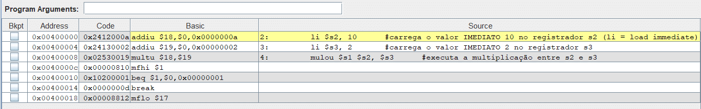 Portanto, se $1 = $17, desviará para o endereço 0x00000001. Tudo é necessário para tratar do overflow, que já foi explicado no artigo “Sinal e Overflow no MIPS”. Na linha 8 temos a palavra-chave break, para parar a execução, e na linha 9 a instrução MFLO $17, que conterá o resultado final da multiplicação.