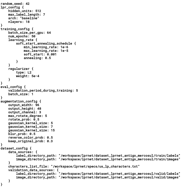 Depois dessas etapas, é necessário criar um arquivo com as especificações do treinamento, como detalhado na seção Creating an Experiment Spec File. Criamos o arquivo /workspace/lprnet/specs/lprnet_spec.txt, copiando o exemplo apresentado neste link e alterando os seguintes parâmetros: