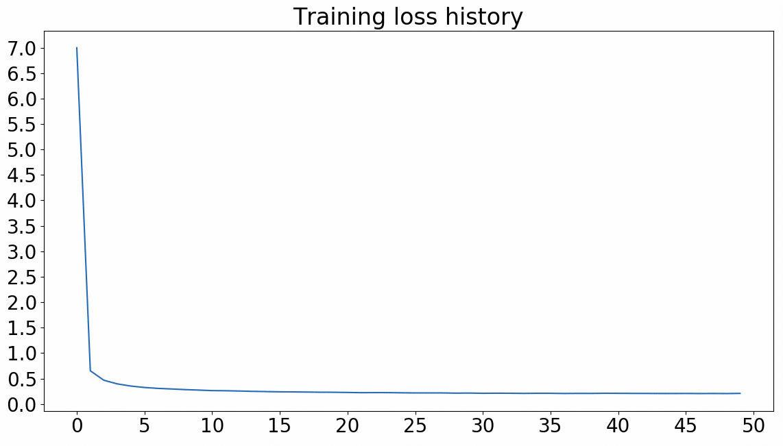 Os modelos gerados ao longo do treinamento, com extensão .tlt, são salvos no diretório passado com o parâmetro -r, neste caso /workspace/lprnet/experiment_dir_unpruned/. O processo de treinamento também gera um arquivo de log training_log.csv com os valores de loss do conjunto de treinamento calculada a cada época e as acurácias do conjunto de validação obtidas a cada cinco épocas. As Figuras 6 e 7 mostram os gráficos gerados a partir do histórico da loss de treinamento e do histórico da acurácia de validação, respectivamente.