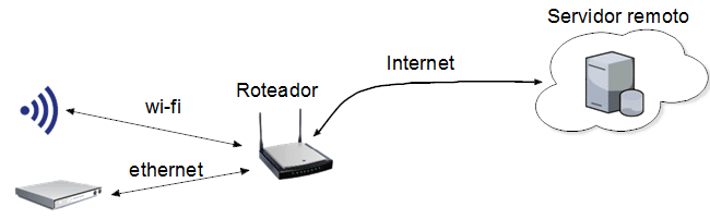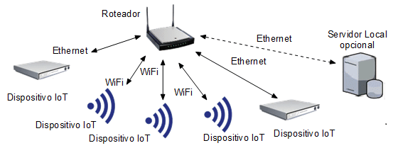 Uma variação desse modelo é a utilização do uso da Internet em conjunto com as redes locais. Os dispositivos se conectam a uma rede local, por meio de conexões Ethernet ou wi-fi, que por sua vez fornecem a conexão com a Internet para a comunicação com o servidor remoto hospedado num serviço de nuvem, como visto na Figura 4.