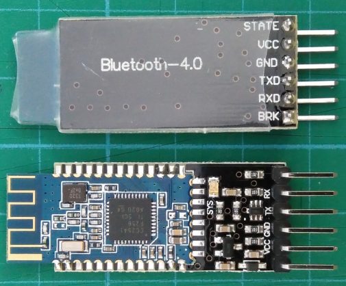 Já para Bluetooth 4.0 temos hoje opções como a HM-10, mostrada abaixo, que faz uso do microcontrolador CC2541 da Texas Instruments.