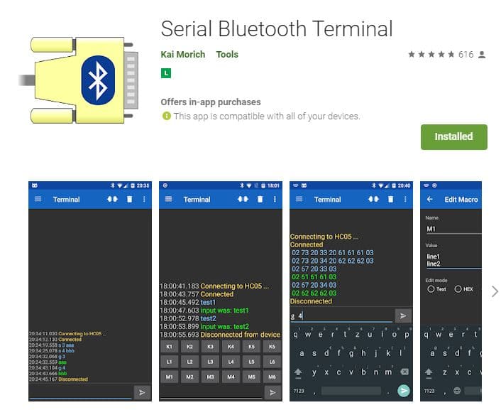 Para fazer o teste rápido de ponte Bluetooth-Serial do módulo BLE1010 eu fiz uso de um Arduino DUE e um celular com Android. Por se tratar de Bluetooth 4.0, a tradicional abordagem de SPP não se aplica, sendo necessário usar aplicativos que façam uso de recursos GATT. Eu testei com o Serial Bluetooth Terminal, aplicativo de Android capaz de conectar a módulos Bluetooth V2 e V4 em diante.