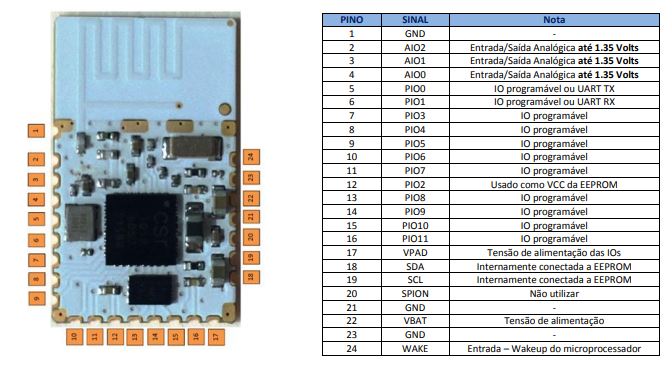 Também na tabela que aparece à direita na figura abaixo é possível ver em detalhes os pinos e correspondentes sinais expostos pelo BLE1010.