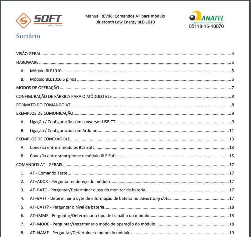 Além do tamanho bem pequeno do módulo BLE1010, um destaque respeitável fica para o firmware para controle do sistema via Comandos AT, cuja tabela de comandos está presente em uma documentação exposta na língua portuguesa.