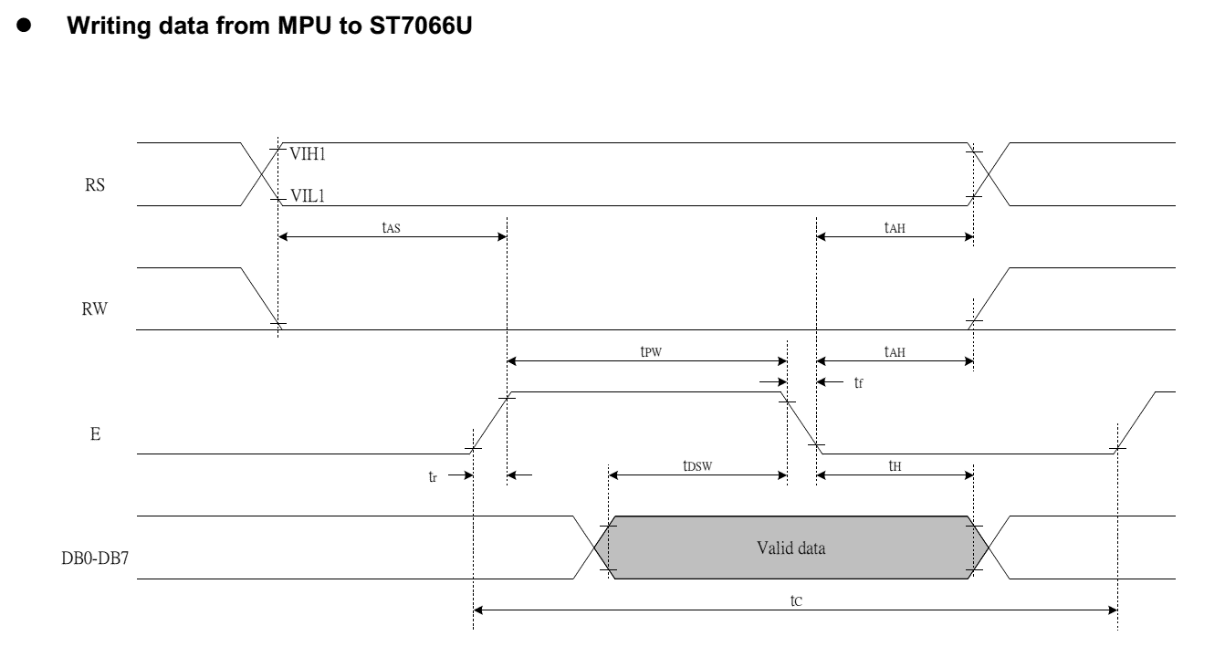 Quando for projetada a conexão do módulo com um microprocessador, é sempre bom lembrar que o operação do módulo LCD é relativamente lenta, se comparada com a de um microcontrolador. Na Figura 8 se pode observar os diagramas de tempos de leitura e escrita da interface com o microcontrolador. É muito importante que se estude esses diagramas e que sejam respeitados os tempos especificados nesses diagramas.