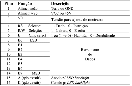 A interface de conexão com um microcontrolador também é padronizada. Ela tem de 14 a 16 pinos, dependendo se o módulo tem ou não backlight para permitir a leitura do display em ambientes escuros. Na Tabela 1 se pode observar a descrição dos pinos.
