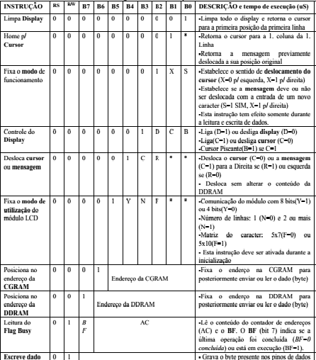 Tabela 2: Instruções de um módulo LCD