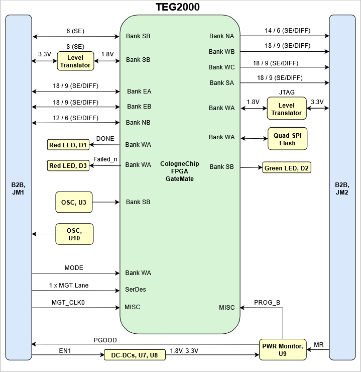 O TEG2000 expõe seus sinais por meio de dois conectores board-to-board, permitindo acesso a múltiplos bancos de I/O. A organização desses bancos é um ponto central do projeto: a maior parte é destinada a uso geral, com suporte tanto a sinais single-ended quanto a pares diferenciais LVDS, enquanto alguns bancos são dedicados a funções específicas, como configuração, clock e interfaces de alta velocidade.