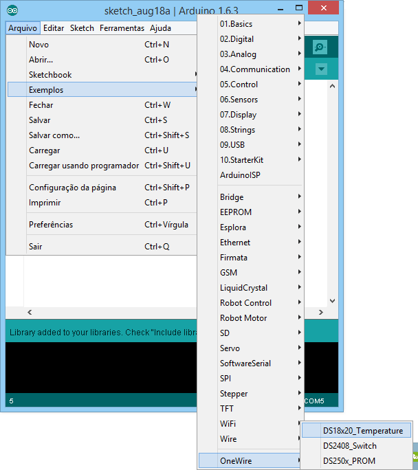 Após instalar a biblioteca, uma nova lista de exemplos é adicionada. Uma delas é específica para nosso sensor de temperatura, e é dele que vamos partir para desenvolver nosso software.