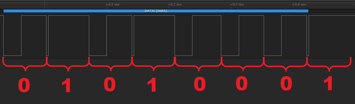 Dessa forma, podemos analisar a troca de um byte completo. Verificando a troca do byte 8Ah, percebemos que os primeiros bits transmitidos são os menos significativos. Dessa forma, a seguencia de bits para formar o byte 8Ah será 0101.0001, pois começará do menos significativo.