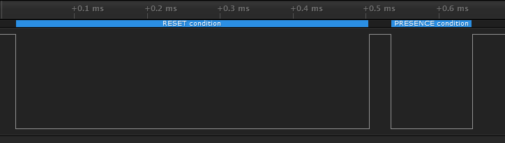 Toda a comunicação 1-Wire é sincronizada com um sinal de reset. Trata-se de um pulso 0 com largura superior a 480µs. Podemos observar esse sinal na imagem abaixo.