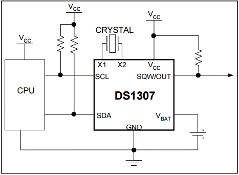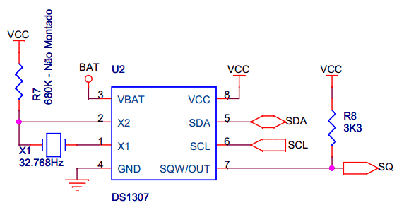 Esse RTC possui uma interface bastante padrão. O canal de comunicação I2C exige apenas dois sinais de comunicação com uma CPU, como vimos anteriormente. Necessita apenas um cristal oscilador externo, sem a necessidade de capacitores ou resistores, pois já possui essa interface interna.