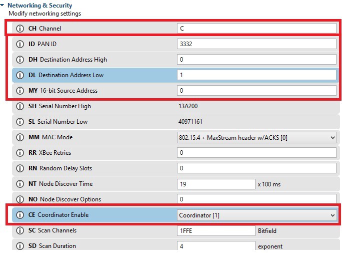 Exceto em casos de redes que não usam dispositivos roteadores (ou seja, redes com coordenador e dispositivos finais somente), há dois campos das configurações do ZigBEE que devem ser preenchidos: My Address e Destination Address (ambos são números de 16 bits, ou seja, de 0000h até FFFFh). Deve-se preencher o My Address com o endereço que o dispositivo deverá assumir na rede e o Destination Address com o endereço do único dispositivo alvo (ou seja, um End Device comunica-se somente com um endereço de dispositivo ZigBEE).