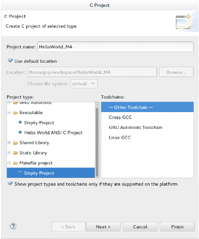 Em seguida uma janela com os tipos de projetos irá abrir. Selecione “Makefile Project” > “Other Toolchain”.