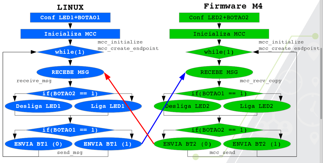 Vamos iniciar os exemplos que estabelecem a comunicação entre núcleos. Conforme fizemos nos exemplos anteriores, o Núcleo A5 comandou o LED1 e Botão1 e o M4 comandou o LED2 e Botão2. Nesse exemplo vamos fazer o Botão1 (A5) enviar uma mensagem para o Led2 (M4) e o Botão2 (M4) enviar uma mensagem para o Led1 (A5).