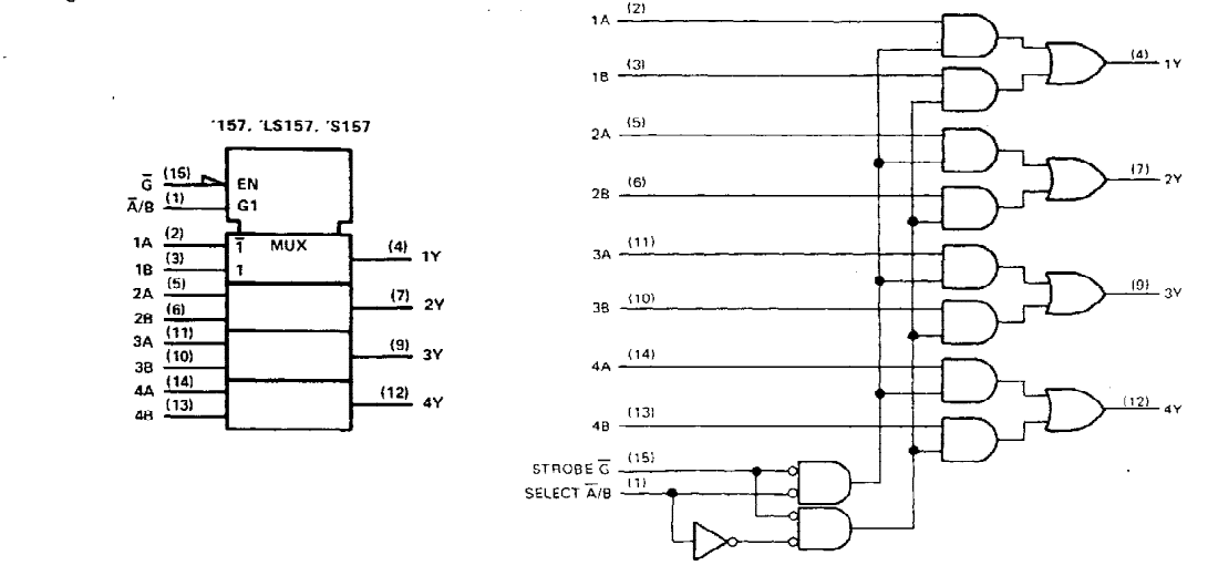 - SN74157 é um Multiplexador com 2 entradas, com 4 circuitos iguais e a saída é a mesma que a entrada.