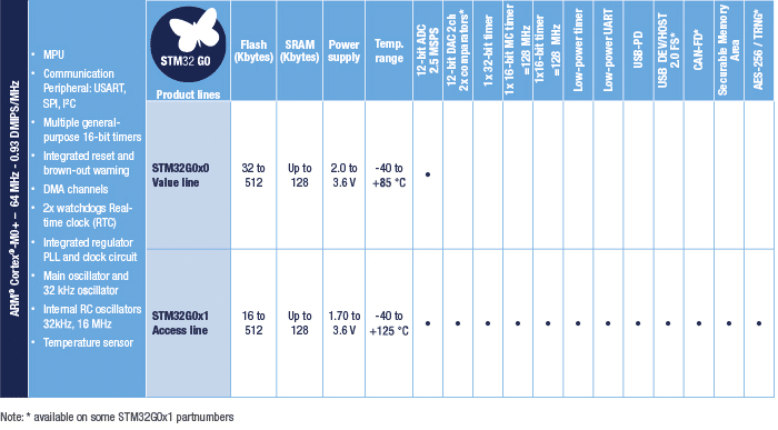 A linha STM32G0x0 Value é altamente competitiva nos mercados tradicionais de 8 e 16 bits. Já a linha STM32G0x1 oferece recursos atualizados em analógico e está pronta para aplicações IoT, com funções de segurança atualizadas.