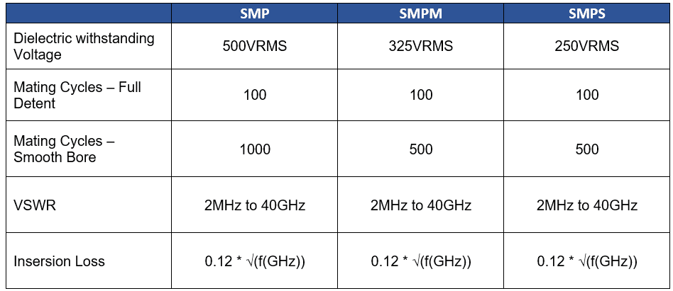 Todos os três conectores oferecem uma Razão de Onda Estacionária de Tensão (VSWR) (2MHz a 40GHz) de no máximo 1,5:1 e perda de inserção de 0,12 (conforme visto na Tabela 1). Eles são classificados para operação de -65°C a +165°C e permitem um desalinhamento radial de até 3° e um desalinhamento axial de no máximo 0,010”.